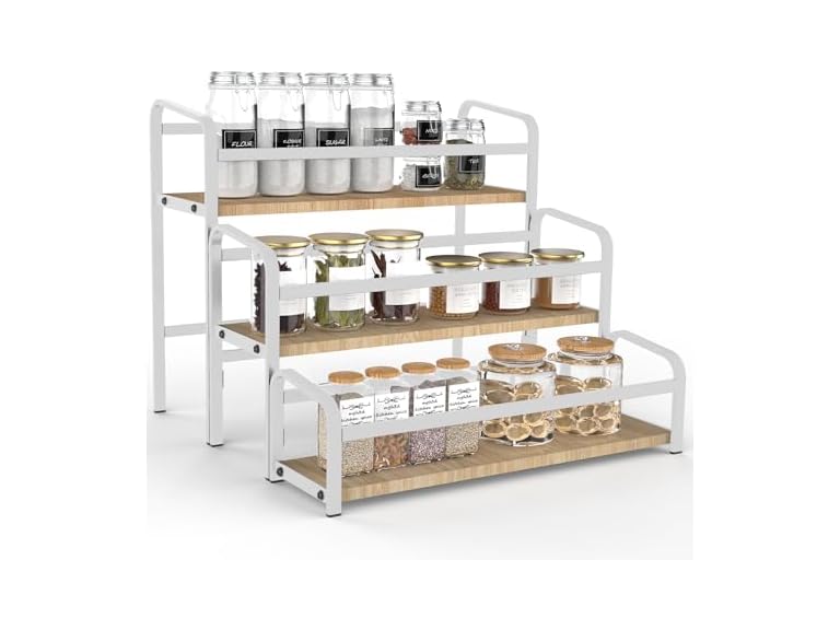 - ⭐【Stable Structure 】The spice rack has painted wood step and metal frame ,every ,Organize not only spice bottles & jars, also vitamin bottles & essential oils and store cosmetics like lipstick and nail polish, make things visible and accessible, keep cabinet pantry or cupboard tidy