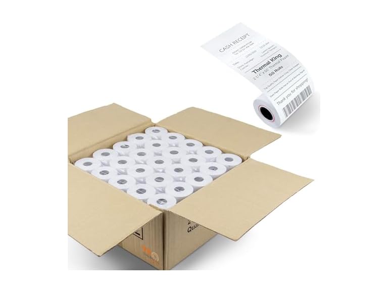 - (1) TK Thermal King, (50 Rolls) 2 1/4" 50' feet White Paper Cash Register POS Receipt, Fits All Credit Card Terminal Great For Cashier Receipt Small Business Premium Quality