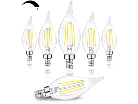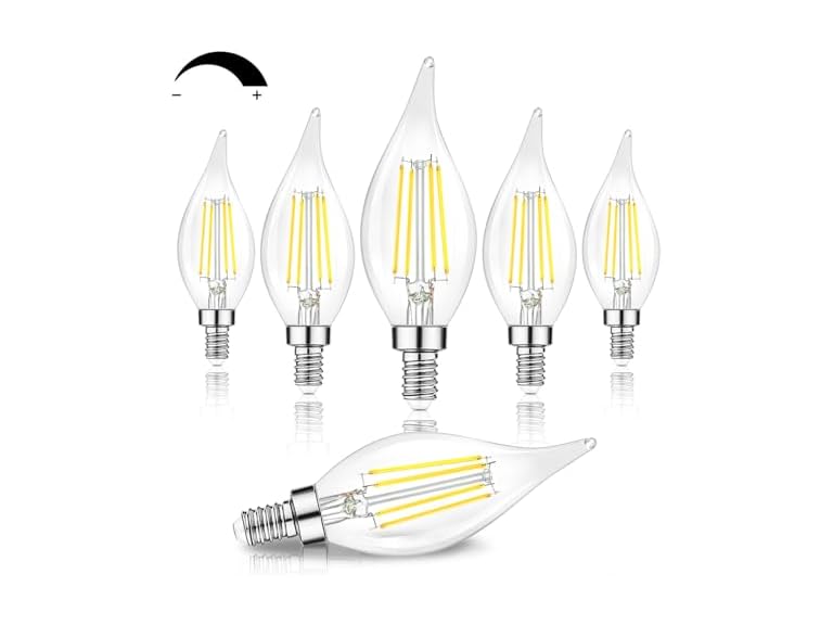 - (1) TOBUSA Dimmable E12 Candelabra LED Bulbs 60 Watt Incandescent Equivalent, 5000K Daylight White, Clear LED Chandelier Light Bulbs 6W, 600lm, CA11 Vintage Ceiling Fan Light Bulbs with Flame Tip, 6-Pack