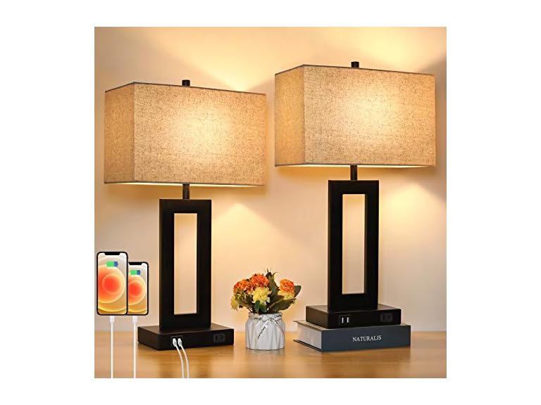 - 【Excellent 2 USB Charging Ports&AC Outlet】Both bedside touch table lamps comes with dual 5v/2.1A USB charging ports. Great design to charge your phones and other electronic devices such as kindle, earphones, speaker, Ipad, ideal for an end table lamp. Are you encountering a less socket around your bed when urgently needs in total darkness? A practical US standard 2-prong AC outlet is an extraordinary setting taken care of all your charging demand in on spot