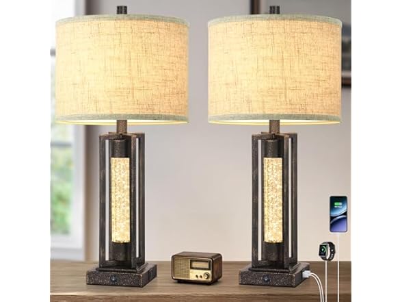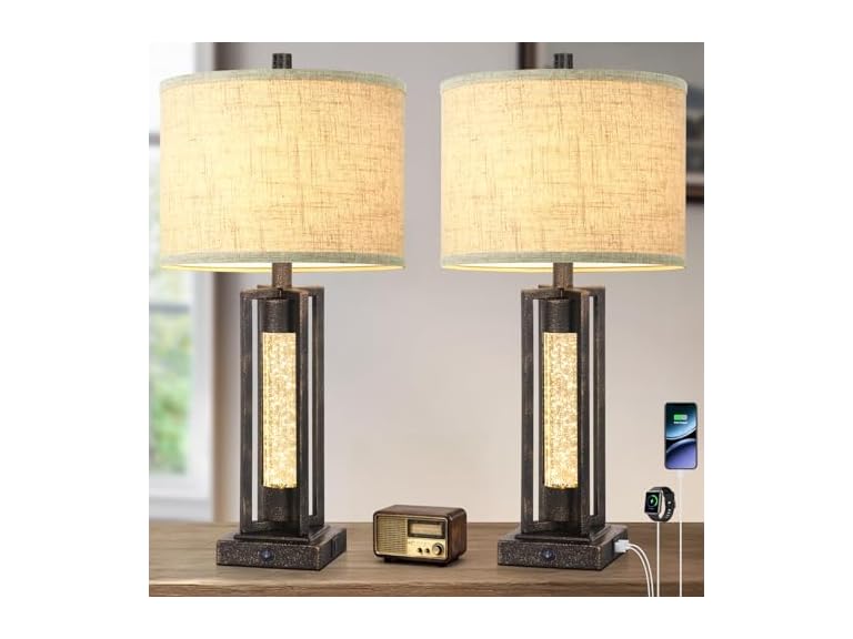 - (1) TOBUSA 26’’ Vintage Table Lamps for Living Room, Rustic Lamps for Bedroom with 2 USB Ports and Crystal Night Light, Farmhouse Bedside Lamps with Linen Shade for Night Stands End Table, (your choice of color and set)