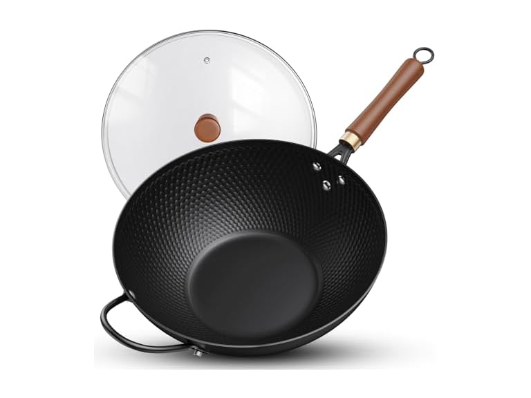 - 【PRE-SEASONED & NATURALLY NONSTICK】Our premium carbon steel wok features a specially engineered surface treatment at 1000°F+, creating microscopic pores that naturally absorb oils to form a self-seasoning, non-stick layer. Like water droplets gliding on a lotus leaf, this oil film allows food to slide effortlessly—no chemical coatings needed. Perfect for healthier cooking and effortless cleanup.