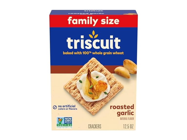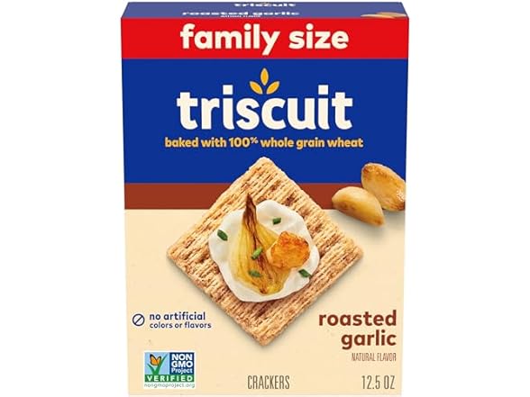 - (1) Triscuit Roasted Garlic Whole Grain Wheat Crackers, Snack Crackers, Lunch Snacks, Family Size, 12.5 oz