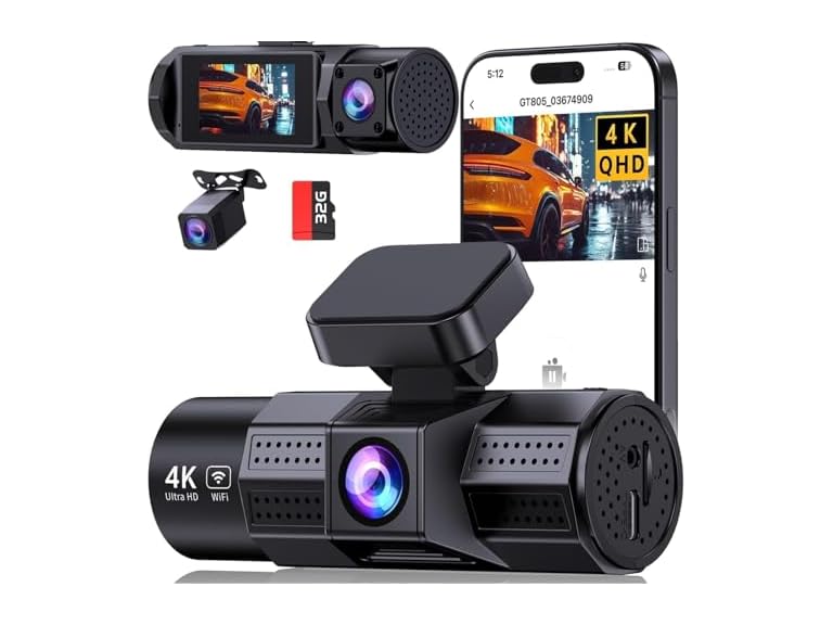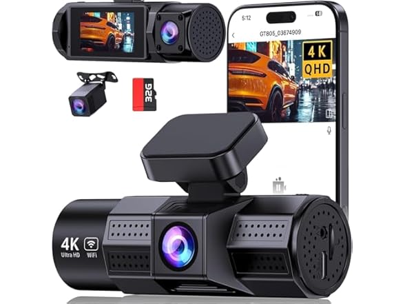 - 3 Channel 4K Dash Cam: 4K front + dual 1080P rear cams (inside/out) with Ultra-Wide Angle shooting from both front and rear cameras, complete coverage of your driving experience