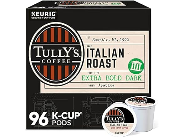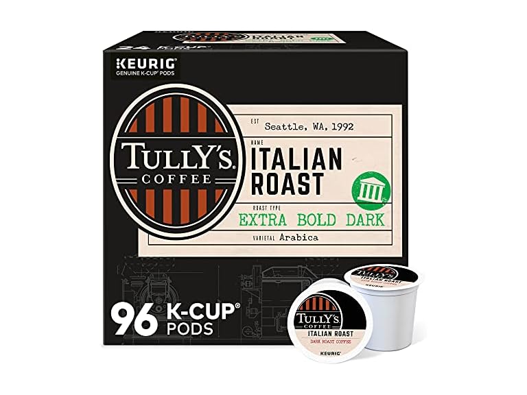 - (1) Tully's Coffee Italian Roast Keurig Single-Serve K-Cup Pods, Dark Roast Coffee, 96 Count