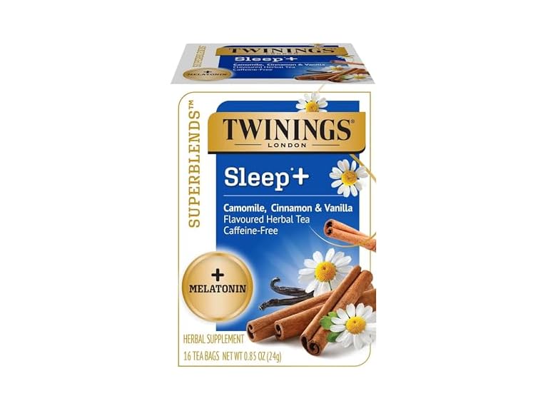 - (1) Twinings Superblends Sleep+ Herbal Tea with 1mg Melatonin Camomile, Cinnamon & Vanilla, Naturally Caffeine-Free, 16 Tea Bags (Pack of 1), Enjoy Hot or Iced