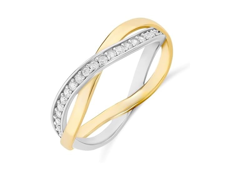 - STYLE: This radiant two-tone 14K gold plated and sterling silver braided polished CZ ring band is size 9 and 5 mm wide; beautiful on its own or stacked with your favorite Amazon Essentials rings.