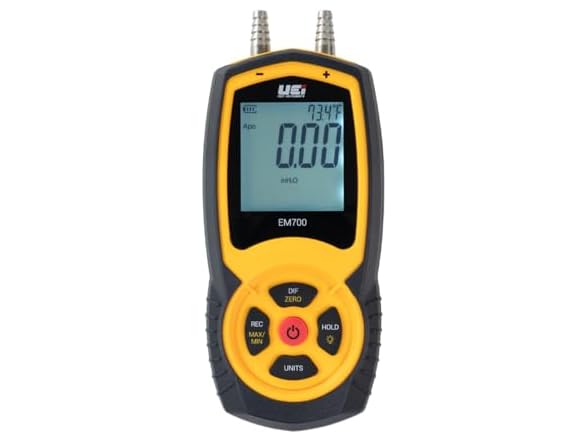 Differential Pressure Manometer Easytouse differential manometer for draft, gas supply, manifold, or burner pressures. The UEi EM700 is a differential manometer capable of capturing maximum and minimum pressure and calculating timed mean average pressure on selected interval. The EM700 features 11 different units of measure with a pressure range of 80 to 80 inH2O and a resolution of 0.01 inH2O. It can be used to measure differential pressure as well as draft, gas supply, manifold, and burner pressure. The manometer also features a large backlit display, ergonomic over molded grip, and a magnetic mount for handsfree testing. EM700 includes pressure tubing, 2 nickelplated brass gas valve adapters, and a padded case. Features. Range 80 inH2O. Differential pressure. Ambient temperature. Easytoread backlit display. Magnetic mount. 11 units of measure. Hold MIN MAX AVG capture. Auto power off. Low battery indication. Zero buttonSpecifications. Range 80 inH2O. Accuracy 0.03 inH2O 3 inH2O, 1% rdg 3 inH2O. Resolution 0.01 in. H2O. Rated Power 4.5 VDC 3 x 1.5 VDC LR6 AA Batteries. Certifications CE, FCC, RoHS, REACH Compliant, UK CA. Operating Temperature 32 F to 104 F 0 C to 40 C. Storage Temperature 14 F to 122 F 10 C to 50 C. Operating Humidity Max 80% RH to 88 F 31 C, Decreasing linearly to 50% RH at 104 F 40 C. Auto Power Off APO 30 Minutes. Dimension 2.95 x 6.25 x 1.41. Weight 2 lbs