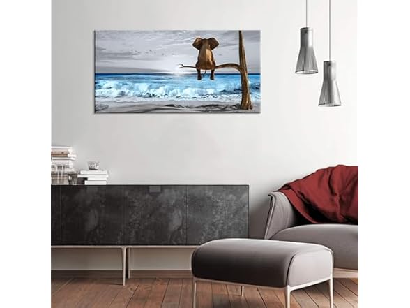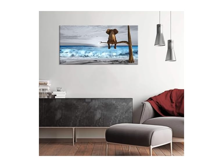 - (1) VAGAOA Elephant Wall Art - Large Beach Canvas Wall Decor for Living Room Coastal Wall Art Blue Ocean Decor Beach Themed Seascape Picture Elephant Artwork Large Paintings for Living Room Stretched 24x48inch