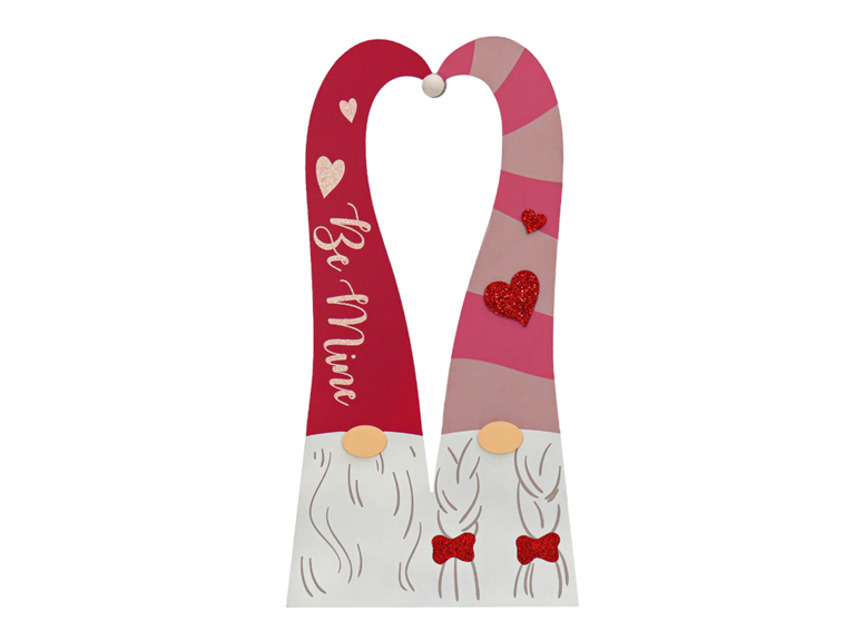 Get in the spirit of Valentine’s Day with this unique standup decoration. It is constructed of lightweight composite wood material and features a male and female gnome wearing tall caps that meet at the top to form a heart. Assorted glittered hearts decorate each cap, along with the message “Be Mine" written in flowing script. A fold out easel attachment on back supports a standing position. For display in indoor or covered outdoor locations.