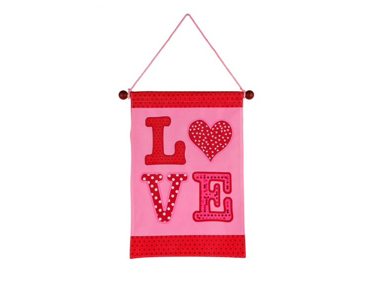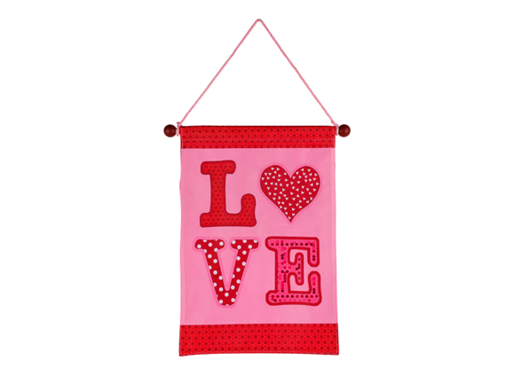 Announce a seasonal sentiment with this Valentine's Day inspired fabric banner decor piece. The letters "LOVE" are stitched with wide outlines and decorative interior motifs, a heart replacing the letter O. The vibrant pink background and matching pattern