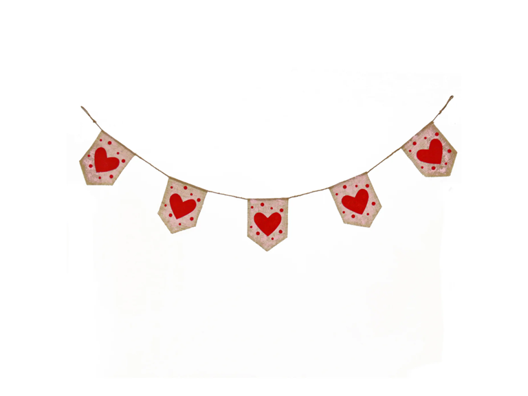 - Includes one Red Hearts and Dots Jute Garland Decoration measuring 6 feet in length and 9 inches in height.