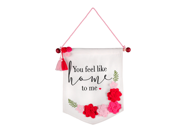 Proclaim the season and your wish for joy with this colorful fabric banner decoration. The sentiment "You feel like home to me" is embellished beneath with a bouquet of pink and red flowers while above opposite like colored pom poms and tassels are found.