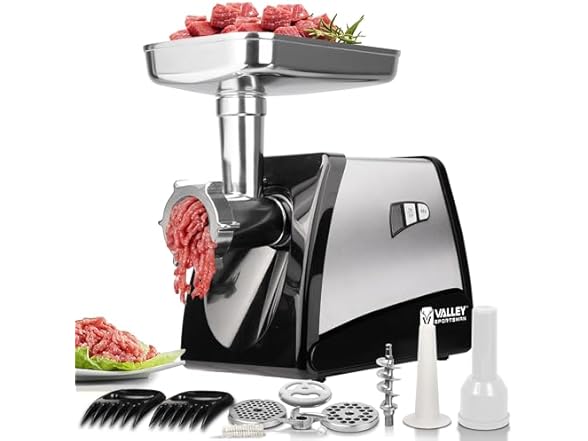 - 【Professional 2-in-1 Versatility】 Valley Sportsman Meat Grinder & Sausage Stuffer combines superior performance with kitchen creativity. Food Grinder Attachments boast 2 stainless steel grinding plates (4.5mm fine/7mm coarse), a stainless steel cutting blade, and a sausage stuffing tube, a high capacity food tray, a food pusher and a cleaning brush, a pair of meat claws—perfect for crafting homemade burgers, sausages, kebabs, or pet food. Designed for multiple kitchen needs.