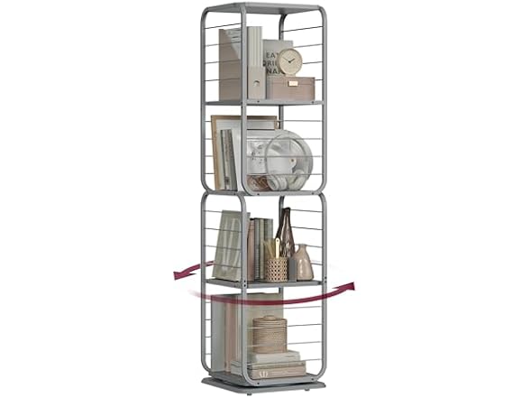 - [360° Rotating Bookcase] With its innovative rotating design, your favorite book is just a spin away. Side wire guards ensure that items won't fall during rotation, and the spacious shelves with large spacing securely accommodate larger books