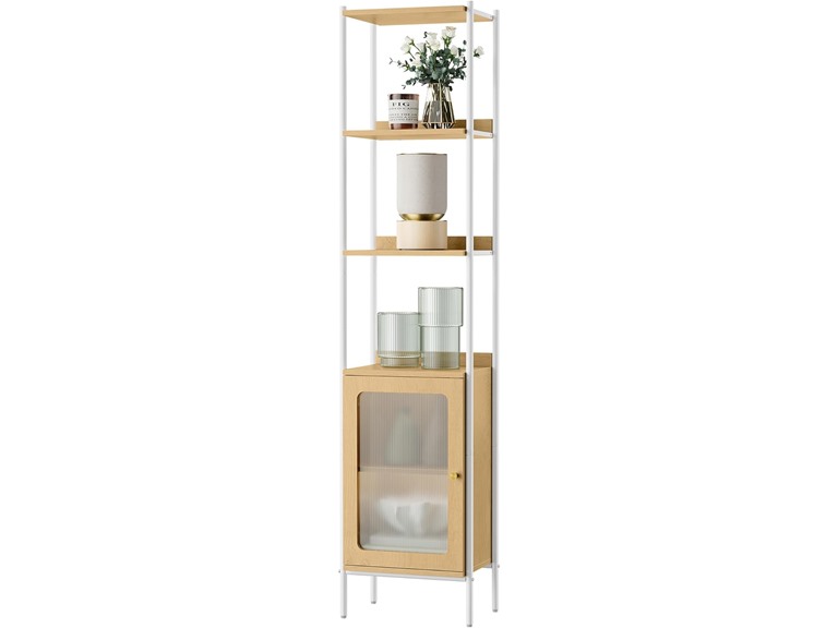 - [Bursting with Contemporary Charm] Infuse a dash of contemporary into your space with this bookcase. Its slender steel legs, paired with a translucent cabinet door, exudes a sense of sophistication and elegance that'll enliven your space