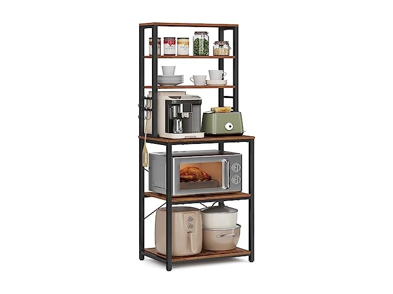 - (1) VASAGLE Coffee Bar, 23.6 Inches Baker's Rack for Kitchen with Storage, 6-Tier Kitchen Shelves with 6 Hooks, Microwave Stand, Industrial, Rustic Brown and Ink Black UKKS024B01