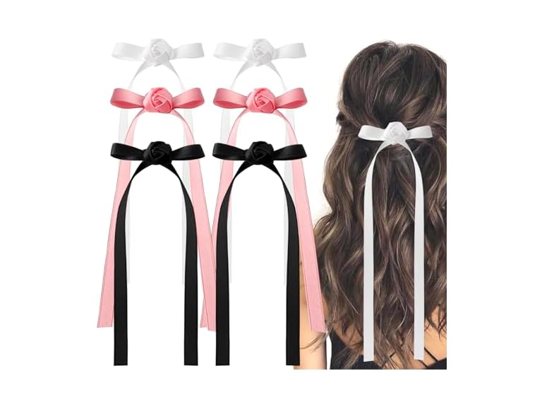 - (1) Vercret 6 PCS Hair Bows Clips for Women Satin Silk Hair Ribbon Bows with Long Tails Hair Accessories Barrettes Claw Hair Clips Pink White Bows for Girls Women