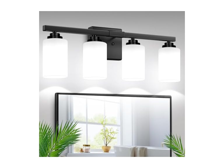In the Box: (1) 4-Light Bathroom Light Fixtures, 27" Modern Vanity Lights Over Mirror with Milky White Glass Shade -Choose Color