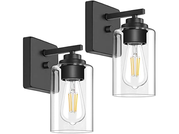In the Box: (1) Set of 2 Wall Sconces for Bathroom, Modern Vanity Light Fixtures, Matte Black Wall Mount Lighting Lanterns, Farmhouse Wall Lights with Clear Glass Shade