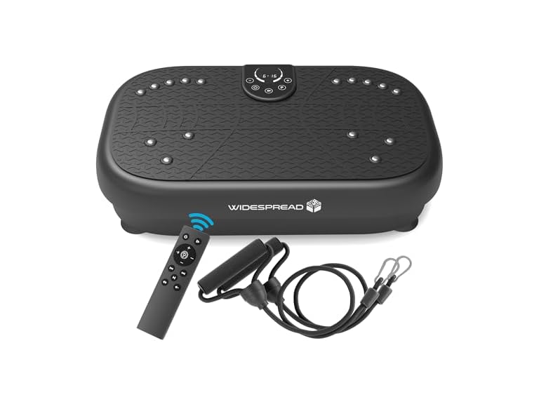 - WHY CHOOSE WIDESPREAD VIBRATION PLATE: Connect to Bluetooth to use it as a speaker; features a magnetic massage function and an LED display for time, speed, and calories burned. Its compact, anti-slip design ensures portability and stability. Comes with a remote control, resistance bands, and a detailed manual—everything you need!