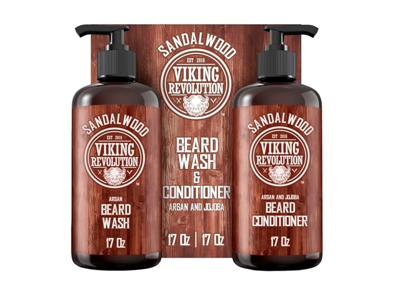 (1) Viking Revolution Beard Wash & Beard Conditioner Set with Argan & Jojoba Oils - Softens and Strengthens - Natural Sandalwood Scent - Beard Shampoo with Beard Oil (17 oz)