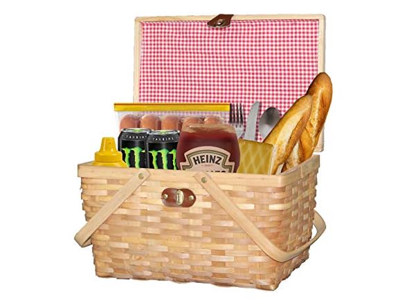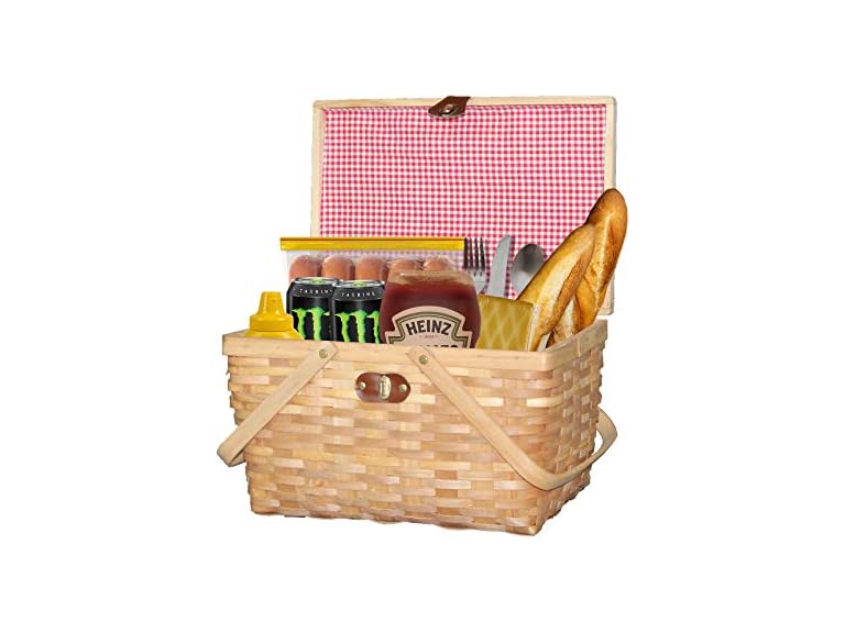 - Vintiquewise.com Gingham Lined Woodchip Picnic Basket with Lid and Movable Handles