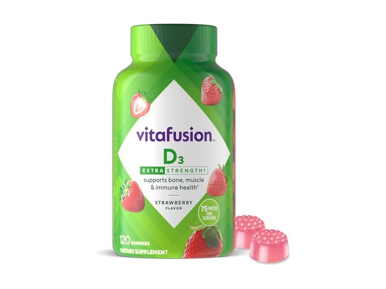 - Includes: One 120 ct bottle of vitafusion Extra Strength Vitamin D3 Gummy Vitamins, Strawberry Flavored Bone and Immune System Support Vitamins (1) (60 Day Supply)