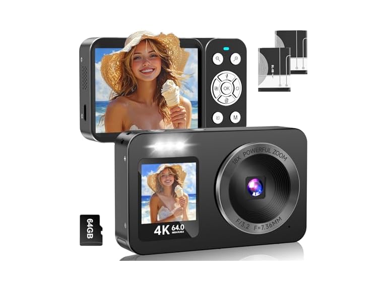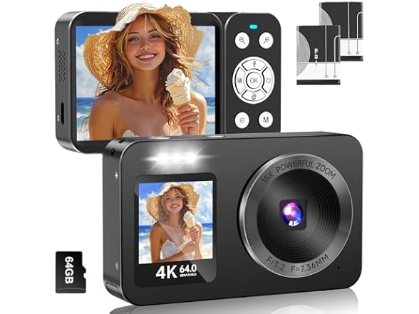 - 【Beginner-Friendly &Dual Screen 4K 64MP Digital Camera】This digital camera features a cutting-edge CMOS sensor, capturing 64MP photos and 4K videos with ease. The unique dual-screen flips with a long press of the “OK” button, perfect for switching angles on the fly. Whether you're traveling or celebrating, every moment stays sharp and vivid. For best results, shoot in good lighting and keep a distance of about 8 ft.