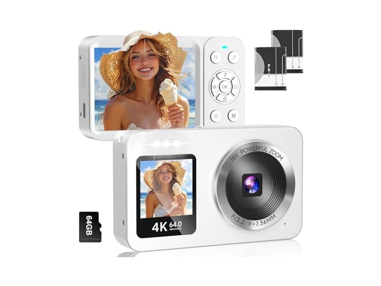 - 【Everything You Need, All in One Package!】Package List: Digital camera, 64GB SD card, 2 rechargeable batteries, USB cable, 2 lanyards, cleaning cloth, and a portable storage bag.The 2.8-inch IPS screen offers an intuitive user experience. (For the best image quality, we recommend transferring photos to a computer for viewing.)This camera makes a perfect gift for Christmas, Valentine's Day, Thanksgiving, graduations, or any special occasion.It’s an ideal first real digital camera for teens who love taking photos and videos.