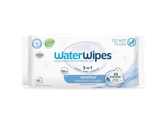 - (1) WaterWipes Sensitive+ Newborn & Baby Wipes, 3-In-1 Cleans, Cares, Protects, 99.9% Water, Unscented & Hypoallergenic, 60 Count