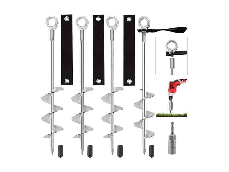 - Wide Applications: A must-have ground anchors for outdoor activities. it can help you secure swings, slides, sheds, shelters, gazebos, travel trailers, campers, camping tents, canopies, fence posts, trampolines, gazebos, trees, etc