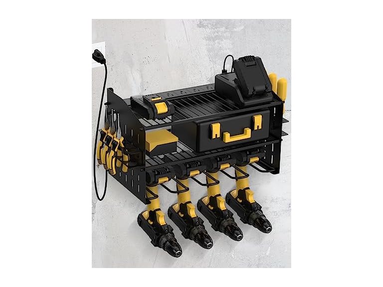 - Power Tool Organizer with Charging Station. The WellMall power tool organizer wall mount is designed with a high-quality power strip, made of Aluminum, including 6 AC outlets with a maximum output power of 1905W. With a 70 inches (5.8ft) power cord, it can handle all your power tool needs and keep them charged and ready to use.