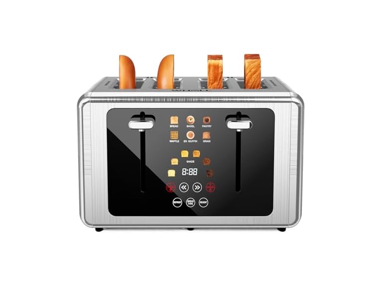 - đ ăIdeal Kitchen Gift & Essentială A perfect gift for any kitchen enthusiast! The Brushed Stainless steel design adds a sleek, durable touch to any countertop, making this toaster not only functional but also stylish. The touchscreen design offers easy control and enhances the modern aesthetic, making it a standout in any kitchen. Ideal for housewarming, weddings, or birthdays, this 4-slice toaster is a must-have essential for any home.