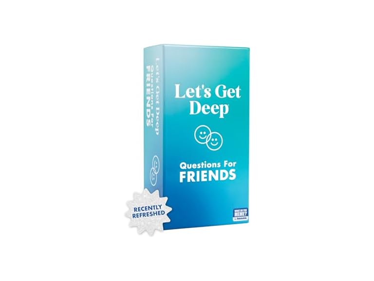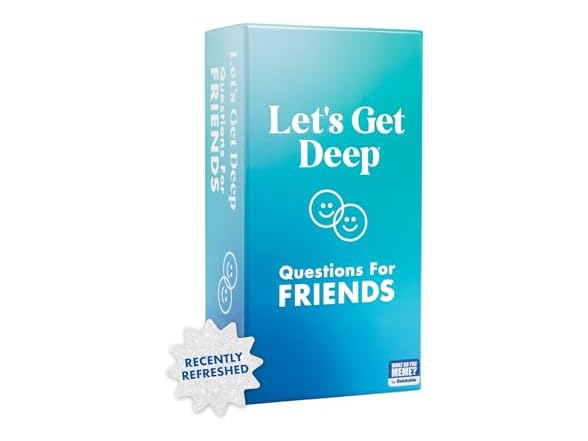 Let's Get Deep: Friends Edition is the latest addition to our best-selling lineup of relationship-building games. This exciting new version takes inspiration from our popular Let's Get Deep couples game and adapts it for friendships. Since there's always more to learn about your besties, this adult card game for game night will revolutionize social gatherings and deepen your connections. Brought to you by Relatable, the go-to makers of viral party games for adults, this game raises the bar on fun adult games for game night. With its thoughtful and accessible questions, the Friendships Edition works equally well for games for teens, games for adults, camping games, and travel games. The game consists of 400 question cards, divided into three increasingly personal levels: Ice Breaker, Deep, and Deeper. As players take turns asking and answering prompts, they uncover surprising facts, shared experiences, and hidden depths about their friends. It's an ideal activity for long-time friend groups looking to catch up, or for new friends seeking to fast-track their connections. A fantastic gag gift or white elephant gift, the wide range of questions ensures there's something for everyone. While some questions will have you rolling with laughter, others will inspire thoughtful reflection and heartfelt sharing. This special blend of lighthearted entertainment and meaningful interaction is what makes Let's Get Deep: Friends Edition a standout choice for any social gathering. So, whether you're planning a cozy night with your closest pals, organizing a game night, or looking for the perfect gift for the social butterfly in your life, Let's Get Deep: Friends Edition has you covered. Get ready to unlock new levels of friendship, create unforgettable memories, and discover that there's always more to learn about the people you thought you knew best. With Let's Get Deep: Friends Edition, every game night becomes an opportunity for connections, laughter, and deeper friendships.