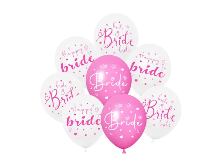 - White pink bride balloons: White latex balloons are printed with the letters of bride, and some patterns such as crowns, stars, hearts, is an indispensable decoration for your bride party.