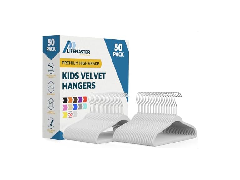 - White Velvet Kids Hangers 50 Pack, 10.83" Non-Slip Baby & Toddler Hangers for Clothes, Space-Saving Slim ABS Plastic with 360° Swivel Hook & Notched Shoulders, Up to 10 lb Capacity