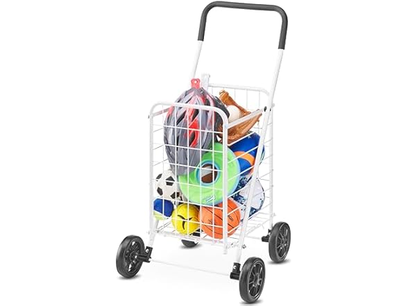 - (1) Whitmor Folding Utility Shopping Cart with Wheels, Heavy Duty Metal Grocery Cart, Portable Foam Handle, Rolling Collapsible Trolley for Groceries, Laundry, Storage, White
