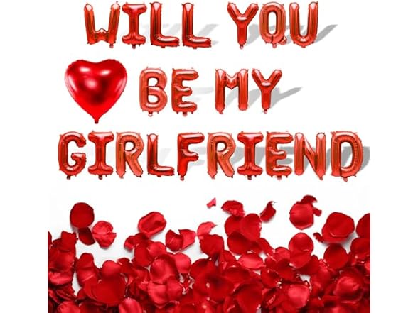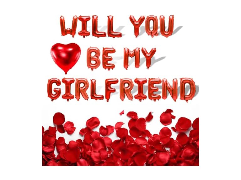 - RICH ACCESSORIES - Includes letter balloons, red heart balloons, and artificial rose petals. This set includes a combination of letter balloons spelling out "Will You Be My Girlfriend," red heart-shaped balloons, and delicate artificial rose petals. The letter balloons allow you to spell out your heartfelt message in style, while the red heart banner and rose petals add a romantic touch to your display, creating a truly enchanting ambiance.