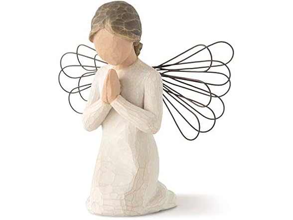 - 5”h hand-painted resin figure of angel in cream dress and wire wings, kneeling with hands in prayer position.