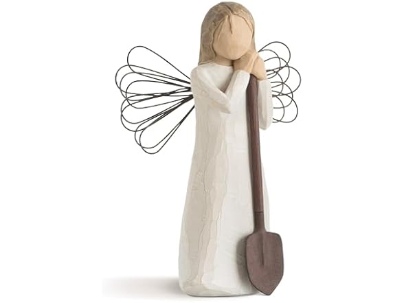 - 5.5”h hand-painted resin figure of a standing angel in cream dress with wire wings, holding brown metal shovel in her hands.