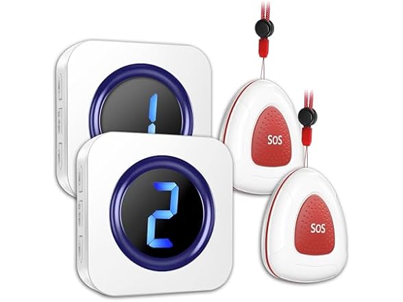 - (1) LIKEPAI Wireless Caregiver Pager Call Button Nurse Call System 900Ft with LED Number Display for Elderly/Patient/Disabled at Home/Hospital/Clinic doorbell(2 SOS Waterproof Call Button & 2 Receiver)