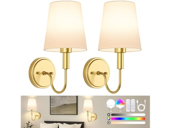 - đăWall Lights with Remote ControlăThese battery operated wall sconce set of 2 included two remote controls. You can use the remote control to adjust various settings, including turning the lights on/off, selecting from 3 color temperatures, choosing from 12 RGB colors, adjusting the brightness across 10 levels, setting a timer for 30/60/120 minutes, and selecting between 2 lighting modes (smooth/flash). For your convenience, each remote has the capability to control multiple wall sconces.