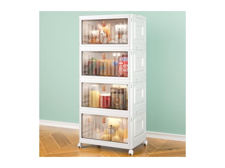 - Stackable & Removable - The storage organizer bins are stackable and mobility. Each layer has matching grooves and clasps on both sides of the top to securely lock the clear storage bins. There are four rotating wheels at the bottom, which makes it easy for you to move. In addition, 2 wheels of the storage shelves have clasps that hold the locker in place to prevent it from moving