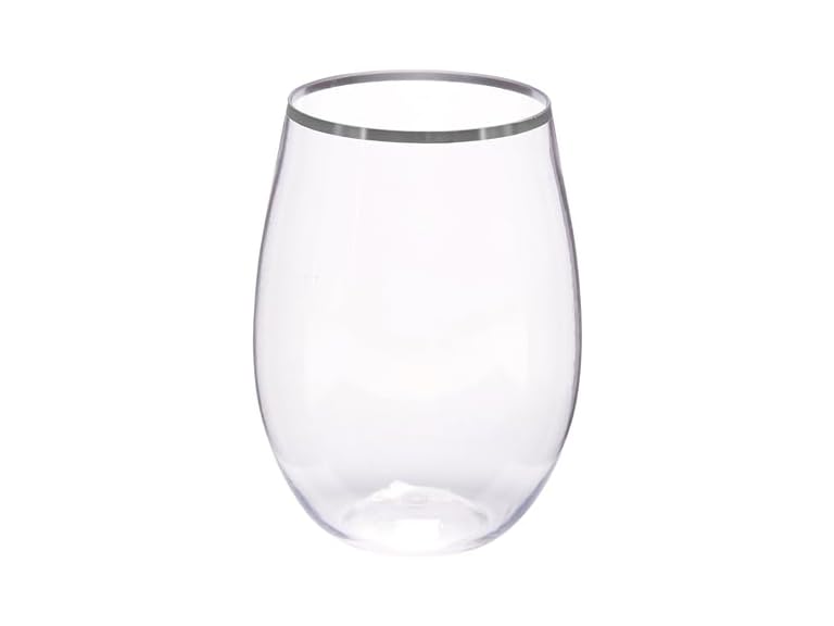 - WNA Reserv 16oz Clear Plastic Stemless Wine Glasses, 64-Pack, Silver Rim For Added Style, Disposable or Reuse, Elegant Shatterproof Drinkware, Shatter Resistant PET