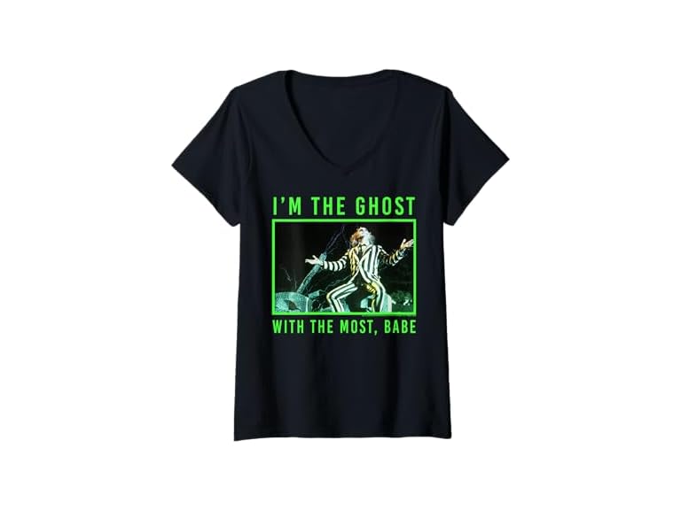 - (1) Womens Beetlejuice I'm The Ghost With The Most Babe V-Neck T-Shirt