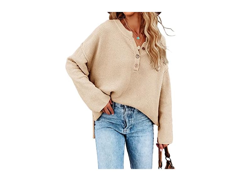 - Oversized pullover sweaters features: v neck, crew neck, button up, batwing tops for women, womens henley tops, comfy, casual slouchy style, loose fit, side split, drop shoulder, solid plain color knit blouse.