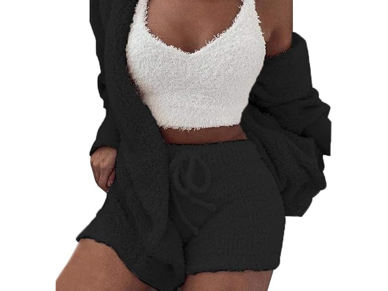 - Features: Fuzzy sherpa sleeveless crop top vest with spaghetti strap, high waist bodycon short with drawstring. Fuzzy warm hooded coat cardigan, sherpa fleece open front jacket, winter 3 piece club outfit. Sexy outfits for women, fuzzy pajama shorts for women, bright color and bursting with vibrancy style, you will never out of style for our sherpa outfits.