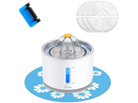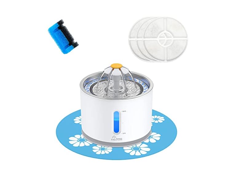 - (1) Wonder Creature Cat Water Fountain Stainless Steel, 81oz/2.4L Cat Fountain with Water Level Window and LED Light for Water Shortage Alert, Cat and Dog Fountain with 3 Filters and 1 Mat