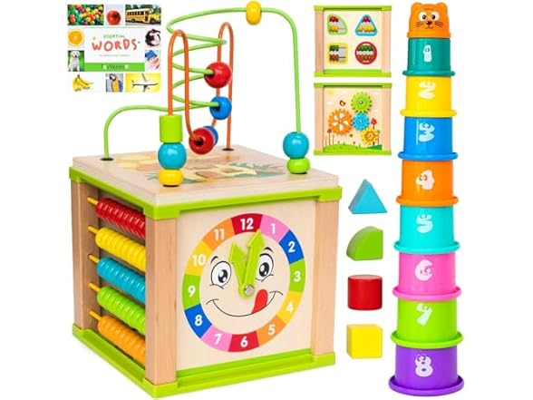 - 💙 FUN AND DURABLE – Sturdy wooden construction, premium craftsmanship, painted with water based non-toxic paint makes it parent's premium choice for educational toys for 2 year olds and 1 year olds. Voted top 10 baby wooden toys for one year old, top 5 best toys for 1 year old boy, and top 5 travel wooden activity cubes by independent group of parents and teachers.